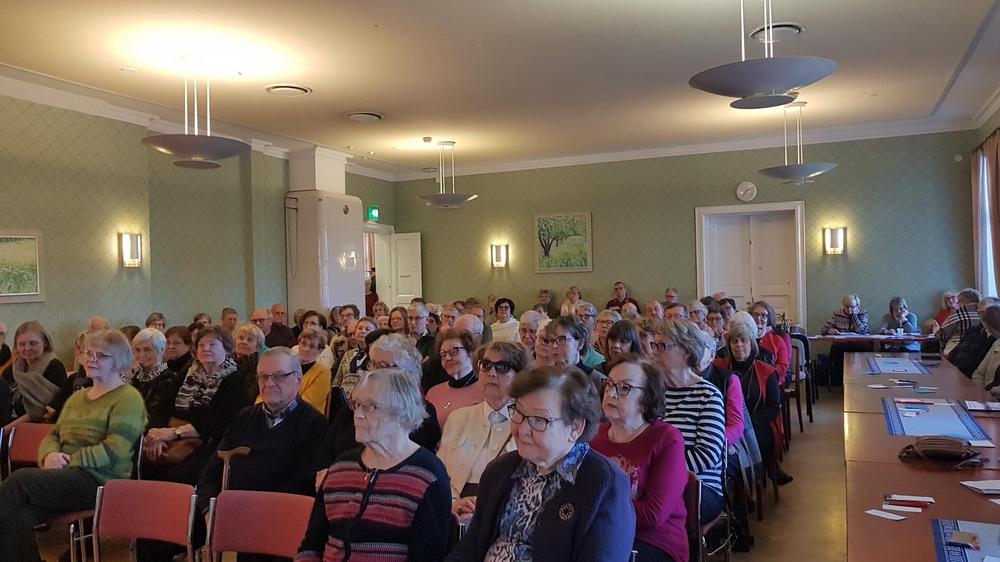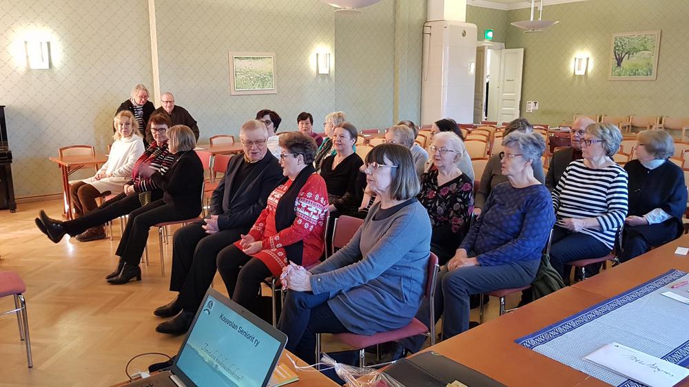 Kauden ensimmäisen kuukausikokouksen alussa ennen kahvia oli tuolijumppaa. Innokkaita osallistujia oli runsaasti.