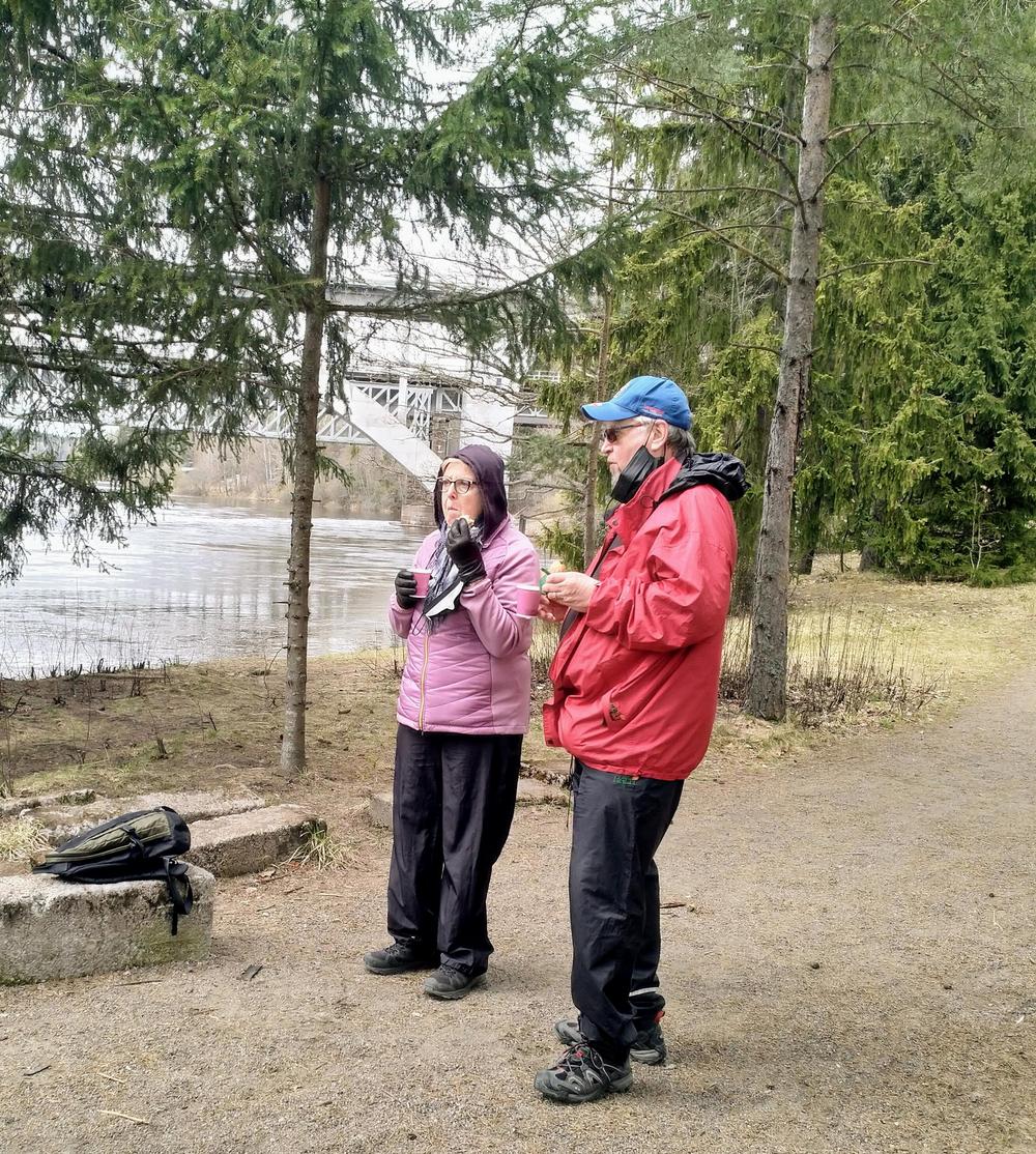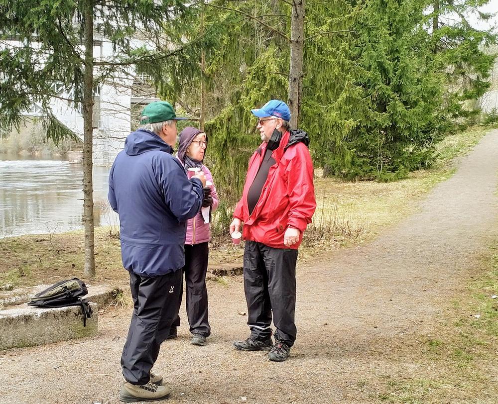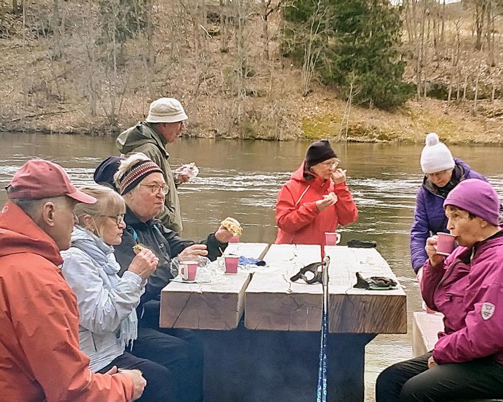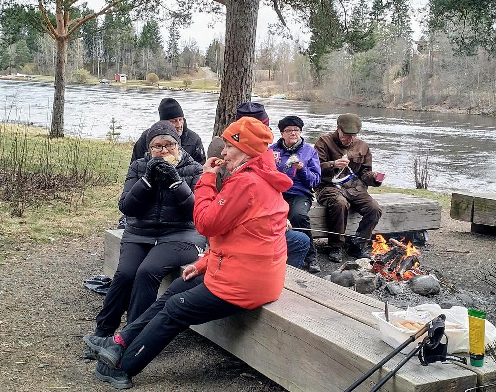 Eripitusten kävelylenkkien jälkeen kokoonnuttiin pienryhmissä Korian sillan kupeeseen kahville ja makkaranpaistoon.