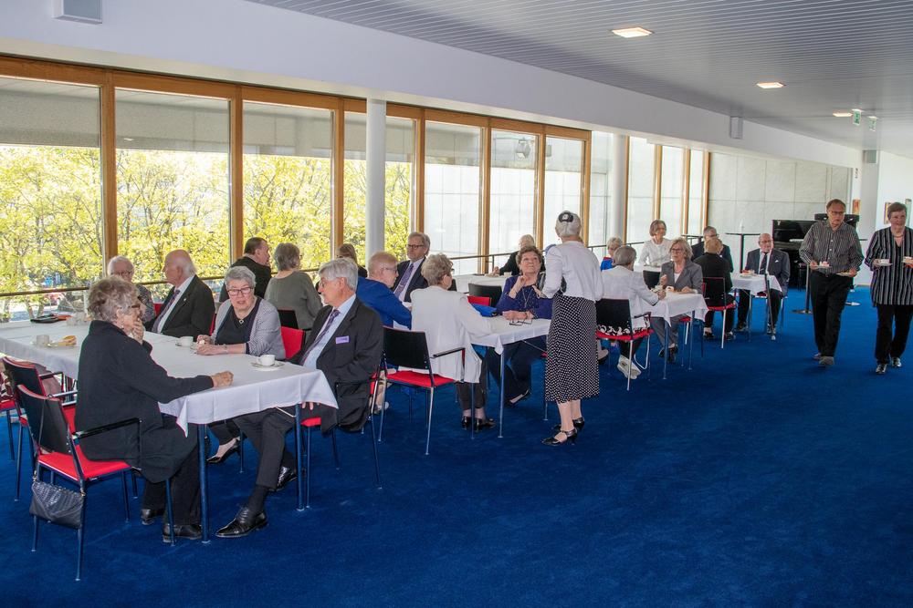 Pääjuhlan aluksi oli kahvitarjoilu. Aurinko lämmitti ja salin täytti iloinen ja innostunut puheensorina, kun parhaimpiinsa pukeutunut juhlaväki tapasi toisiaan. Paikalla oli noin 120 henkilöä.