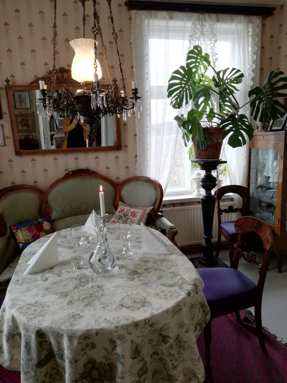 Tertin kartanossa on kauniisti sisustettuja huoneita tyyliin sopivine tapetteineen. Hauska yksityiskohta on ikkunalla kukkiva erikoinen kalliotyräkki.