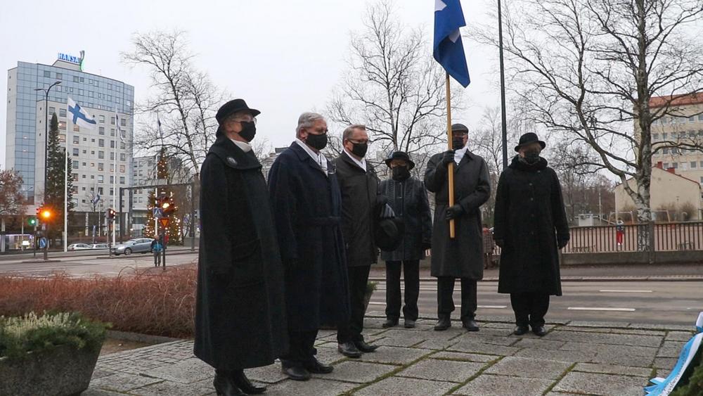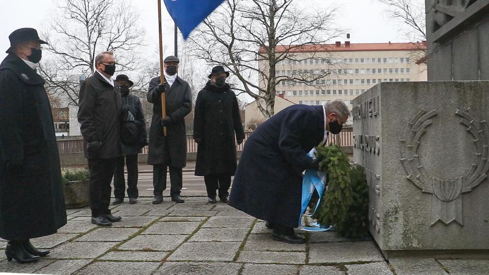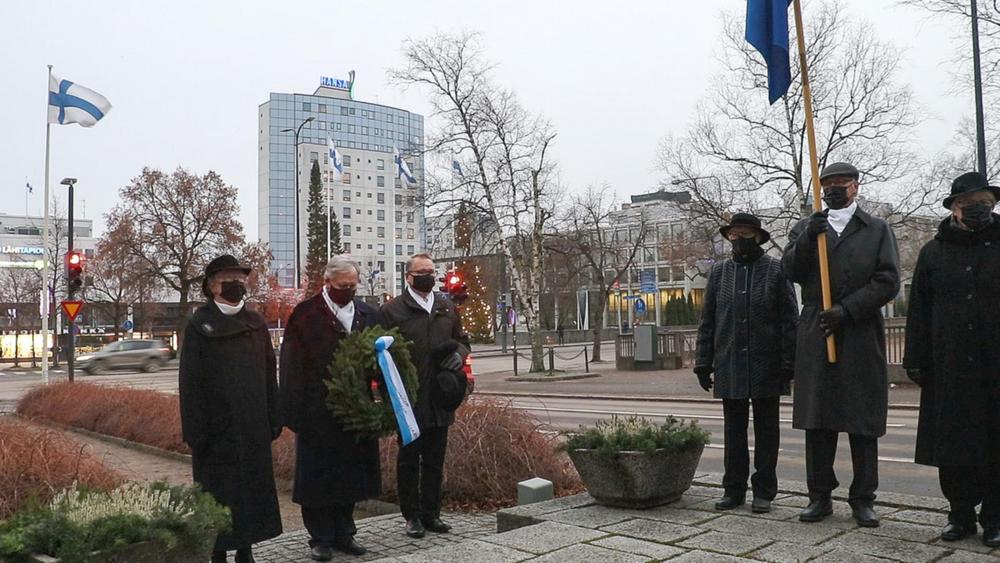 Kouvolan Seniorit itsenäisyyspäivän kunniakäynnillä Vapauden patsaalla.