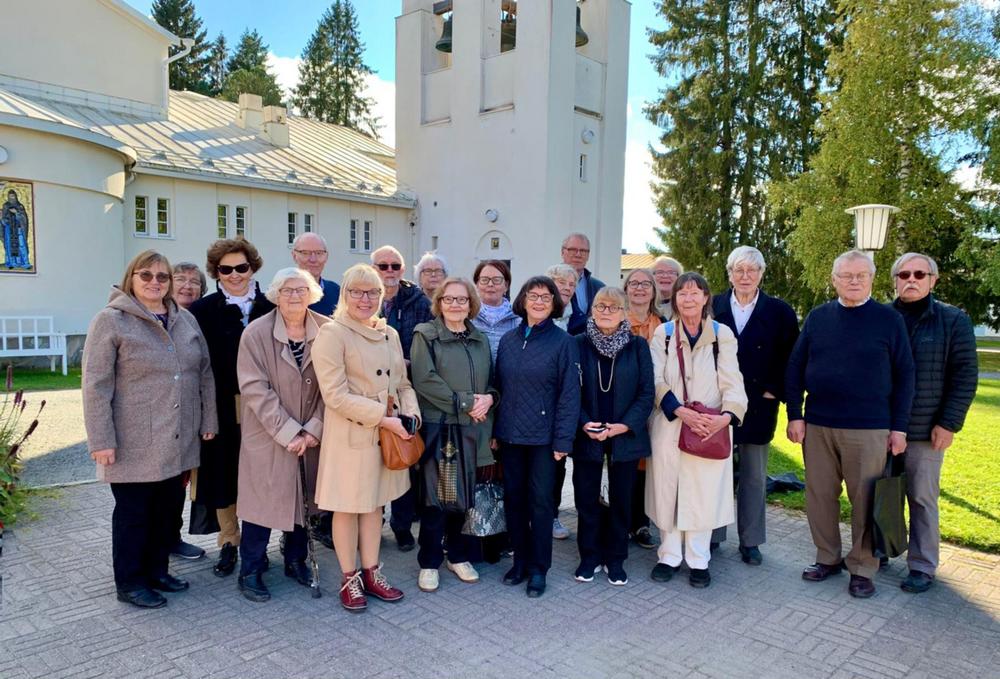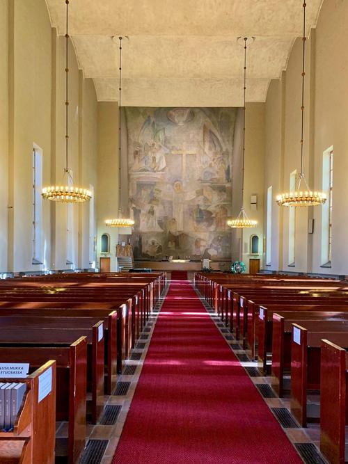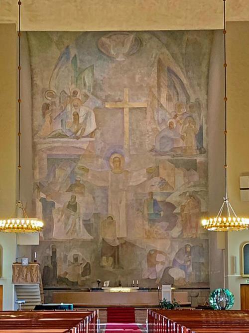 kirkkoon. Kirkko on valmistunut 1939. Ihailimme yli 240 m2:n alttarifreskoa. Se on tiettävästi Pohjoismaiden suurin fresko. Sen on maalannut Lennart Segerstråle. Puheenjohtaja Raimo Kinnunen kertoi, että hänet oli vihitty kirkossa.