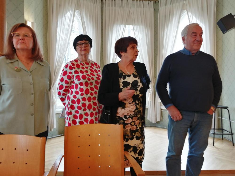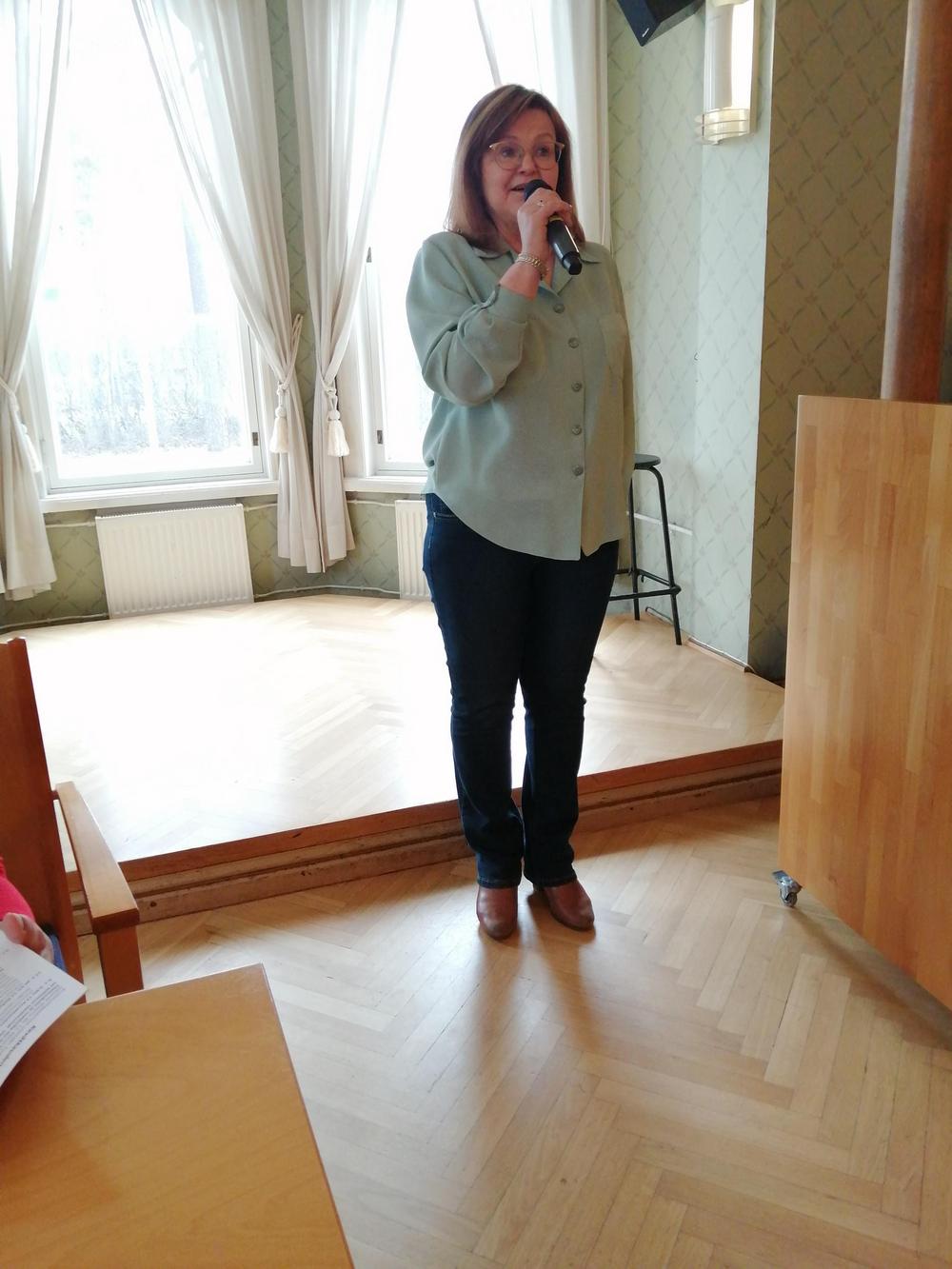 Arja Mäkilä lausui meille alkuun runoja. Hän kuuluu kerhoryhmään Satuilevat Seniorit ja harrastaa myös runoutta kansalaisopistossa. Kuulimme mm. Eeva Kilven Elämäni evakkona.