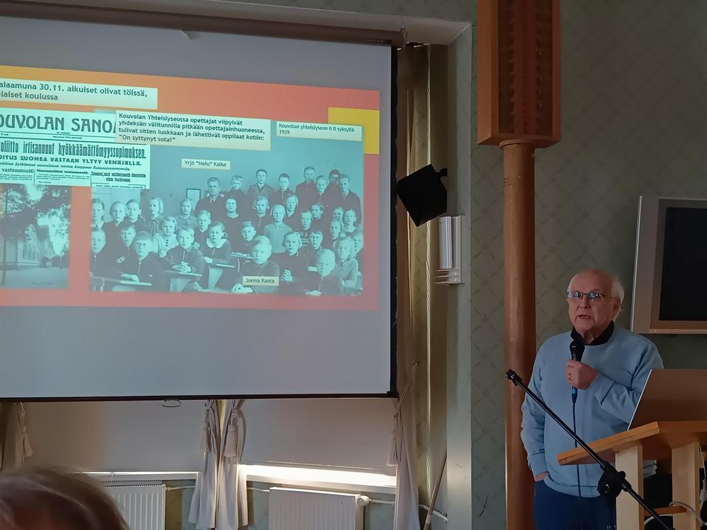 Vieraana oli Sakari Viinikainen, joka esitelmöi aiheesta "Kouvolan kovat päivät" eli Talvisodan pommituksista. Esitys tarjosi merkittävää historiallista tietoa ja herätti suurta mielenkiintoa. Tilaisuudessa oli mukana 13 uutta jäsentä ja osallistujamäärä nousi yhteensä 99:ään. Ohjelman yhteydessä järjestettiin myös arpajaiset. Tilaisuus onnistui erinomaisesti, ja uusia jäseniä kannustettiin osallistumaan aktiivisesti yhdistyksen toimintaan jatkossa.