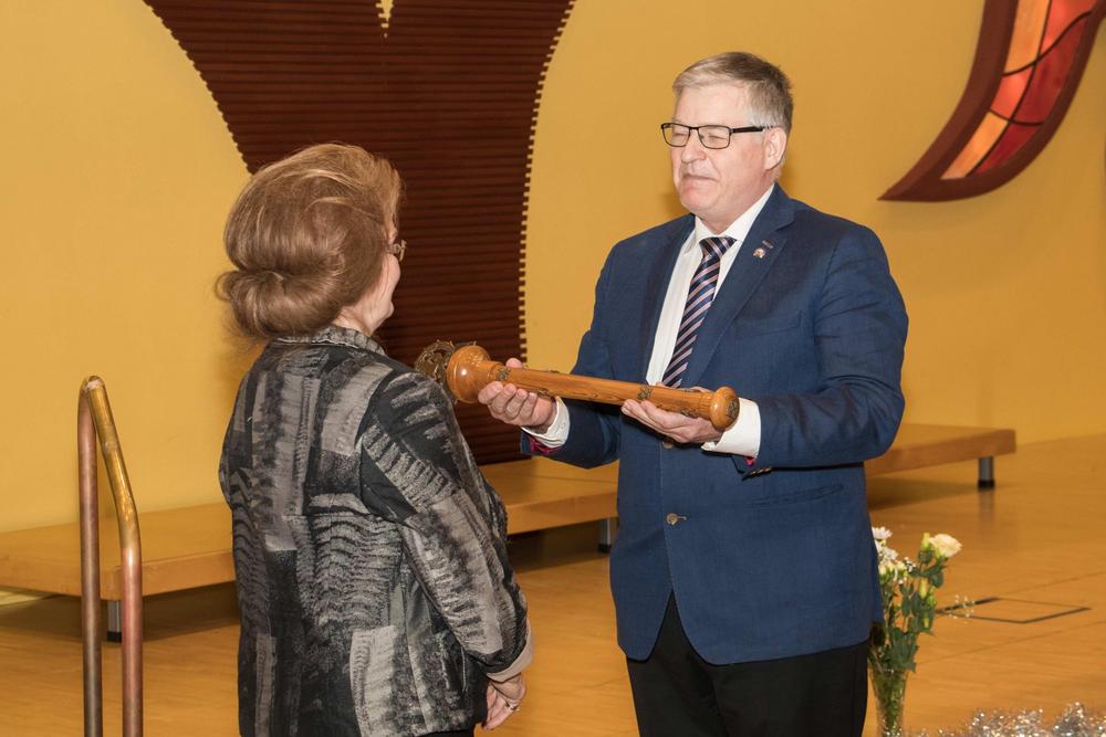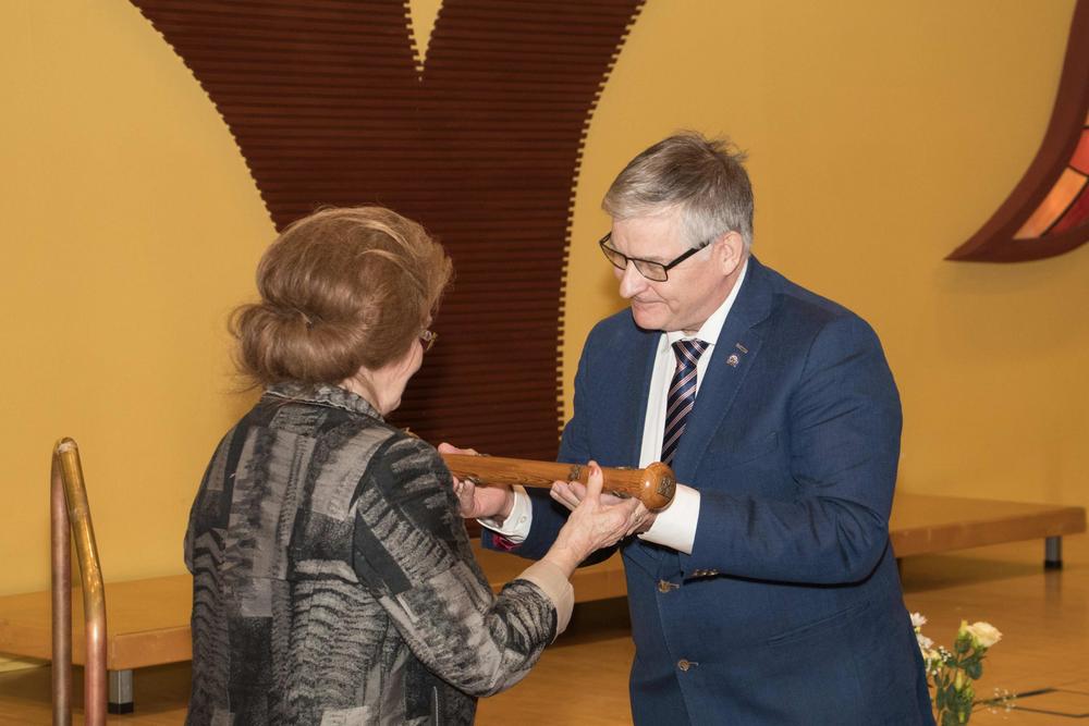 Arvo Saariston ja Pekka Ainalin musiikkiesityksen jälkeen edellinen puheejohtaja Seppo Lehtonen luovutti Oltermannin sauvan uudelle puheenjohtajalle Marjatta Nykäselle. Sauvan on suunnitellut ja valmistanut yhdistyksemme jäsen taiteilija Antti Heiskanen.